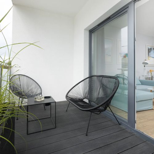 Przestrzeń apartamentu oferuje salon z aneksem kuchennym oraz łazienkę z prysznicem. Apartament wyróżnia się przytulnym wystrojem, estetyką oraz funkcjonalnością. Część mieszkalna wyposażona w dwie wygodne sofy, TV i wyjście na taras stanowi doskonałe miejsce odpoczynku i relaksu. Przestrzenny taras wyposażony w meble ogrodowe będzie świetny na odpoczynek w ciepłe, letnie wieczory. Dodatkowo, wyposażony w wysokiej jakości sprzęt, aneks kuchenny umożliwia przyrządzenie ulubionych posiłków. Wyjątkowy design oraz kompleksowe wyposażenie w niezbędne akcesoria kuchenne oraz łazienkowe gwarantują komfort pobytu. Rodzice podróżujący z dzieckiem mogą znaleźć na wyposażeniu również łóżeczko oraz krzesełko dla swojej pociechy.