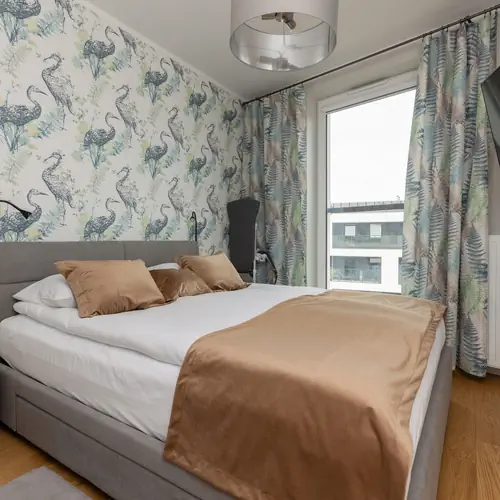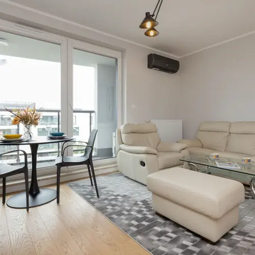 Apartament o powierzchni 45 m2 może wygodnie pomieścić 2 osoby. Przestrzeń mieszkania składa się z salonu z wydzielonym aneksem kuchennym oraz sypialni z łóżkiem małżeńskim, jak i stylowej łazienki z prysznicem. Wykończenie wnętrza w przyjemnej palecie barw, z wykorzystaniem stylowego umbelowania sprawia, że mieszkanie ma bardzo wyszukany, jak i przyjemny klimat. To doskonały wybór dla każdego, kto ceni sobie wygodę i funkcjonalność, ale także estetykę. Przestrzeń obiektu jest dogodnie zaprojektowana, wychodząc naprzeciw wszelkim potrzebom gości. W salonie znajduje wspaniały skórzany zestaw wypoczynkowy, na którym można wypocząć po całodziennym zwiedzaniu stołecznych atrakcji. Zainstalowana w mieszkaniu klimatyzacja zapewni przyjemną temperaturę w nawet najgorętsze dni. Apartament gwarantuje dostęp do wyposażenia multimedialnego – w apartamencie znajdują się dwa telewizory z kanałami kablowymi i technologią SmartTV jak i bezpłatne łącze internetowe Wi-Fi. Apartament przystosowany jest do pracy zdalnej. Dla ułatwienia rozpoczęcia każdego pobytu zapewniony jest bezpłatny zestaw kosmetyków (mydło, szampon i żel pod prysznic), ręczniki oraz pościel.