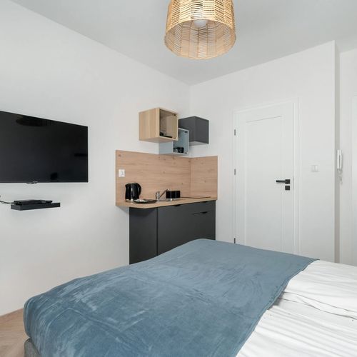 Komfortowe studio o powierzchni 17 m², może ugościć do 2 osób. Składa się z salonu z aneksem kuchennym oraz łazienki z prysznicem. Wnętrze zostało urządzone z dbałością o szczegóły, co zapewnia ciepłą i domową atmosferę. Aneks kuchenny wyposażony jest w niezbędne akcesoria kuchenne, takie jak: lodówka, czajnik elektryczny czy płyta indukcyjna, przydatne do codziennego przygotowywania posiłków. Goście będą mieli do dyspozycji słoneczny salon z podwójnym łóżkiem oraz telewizorem, z którego jest również wyjście na balkon z meblami ogrodowymi, tworzący idealną przestrzeń do wypoczynku na świeżym powietrzu. W łazience Goście mają do dyspozycji prysznic oraz toaletę, a to wszystko w przytulnie urządzonym wnętrzu. Dodatkowo rozrywkę stanowią multimedia takie jak telewizja oraz dostęp do sieci Wi-Fi. Na dobry początek pobytu zapewniamy gościom bezpłatny zestaw kosmetyków, ręczniki oraz pościel.