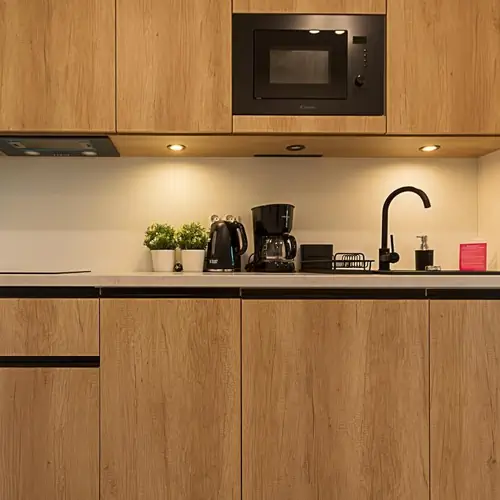 W apartamencie znajduje się aneks kuchenny przystosowany do zaspokajania codziennych potrzeb. Do dyspozycji Gości są sprzęty AGD m.in. lodówka, płyta elektryczna z okapem oraz komplet naczyń, sztućce, akcesoria kuchenne, szklanki i kieliszki do wina. Wszystko, co potrzebne by samodzielnie przygotować posiłki i cieszyć się wspólnymi chwilami z bliskimi.