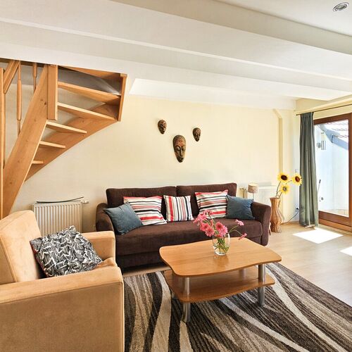 Przestronny dwupoziomowy (40m2 plus antresola 9m2) apartament znajduje się III piętrze budynku. Składa się z pokoju dziennego z aneksem kuchennym i balkonem oraz sypialni położonej na antresoli. Sypialnia wyposażona jest w łoże małżeńskie oraz szafę. W pokoju dziennym znajduje się rozkładana dwuosobowa kanapa o wymiarach 130x195 oraz fotel, telewizor z płaskim ekranem. Aneks kuchenny wyposażony w podstawowe przybory kuchenne, przedłużony blat przy którym można spożywać posiłki, cztery taborety, kuchenkę elektryczną z dwoma miejscami grzejnymi, lodówkę, czajnik elektryczny, ekspres przelewowy do kawy. Łazienka z wanną oraz pralką. Za dodatkową opłatą istnieje możliwość wynajęcia jednego miejsca parkingowego na terenie posesji.