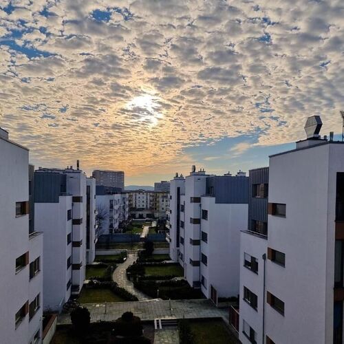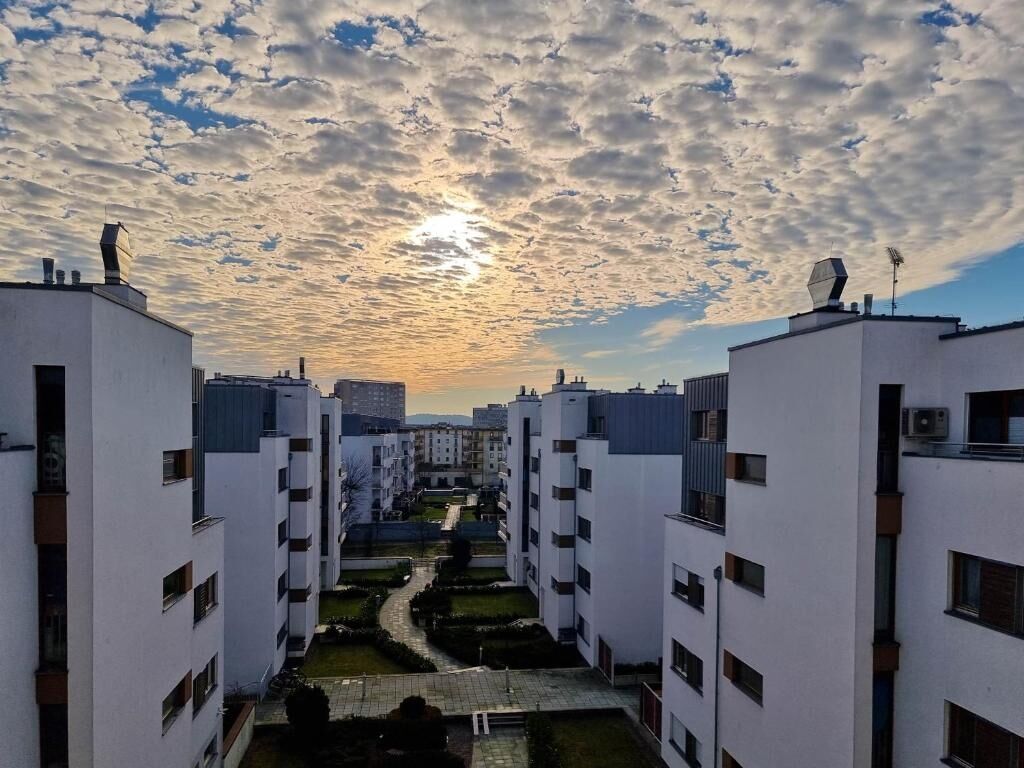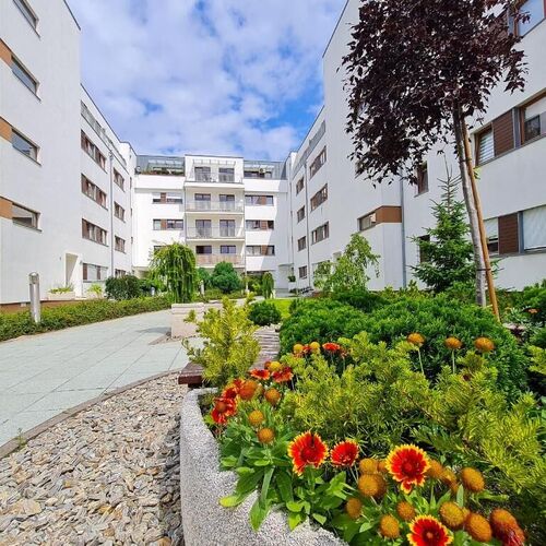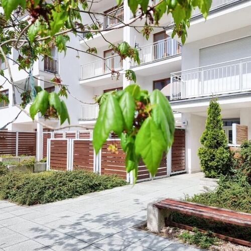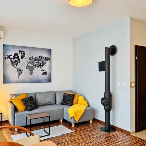 1-pokojowy apartament (31m2) z aneksem kuchennym i balkonem położony jest na 4 (ostatnim) piętrze budynku wyposażonego w windę. Duże, panoramiczne okna skierowane są na południe dzięki czemu apartament jest bardzo jasny, słoneczny i ciepły. Apartament wyróżnia duży balkon z widokiem na wewnętrzny, zielony dziedziniec. W oknach wiszą firany i ciemne zasłony. Przestronny pokój wyposażony jest w narożnik z funkcją spania (powierzchnia po rozłożeniu 140x200cm), rozkładany fotel o powierzcni spania 70x180cm , 2 fotele, stolik kawowy, odbiornik telewizyjny z dostępem do lokalnej telewizji kablowej.
