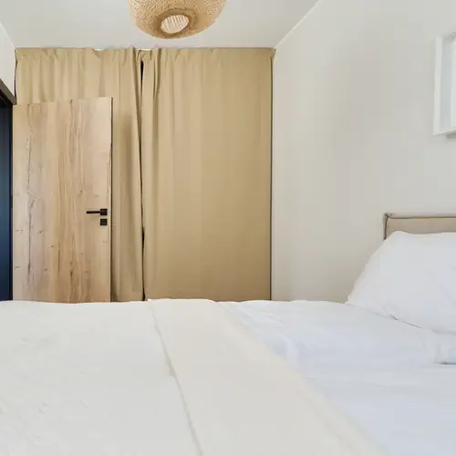 Klimatyzowany apartament urządzony w świeżym i nowoczesnym stylu gwarantuje miejsce noclegowe dla 6 osób. To doskonały wybór dla wymagających Gości - tutaj wysoki standard wykończenia idzie w parze z funkcjonalnością. W skład powierzchni apartamentu o metrażu 50 m² wchodzą dwie sypialnie, salon połączony z aneksem kuchennym oraz stylowa łazienka z wanną. Modne umeblowanie, dopasowana paleta barw, jak i nietuzinkowe dodatki, tworzą piękne i estetyczne wnętrze. Salon posiada wyjście na balkon z miejscem do relaksu, dzięki czemu dzień powitać można filiżanką kawy na świeżym powietrzu! Multimedia w apartamencie obejmują nowoczesny telewizor z technologią SmartTV i pakietem kanałów oraz szybkie łącze Wi-Fi. Mieszkanie, dzięki przestronnym pokojom oraz kompleksowemu wyposażeniu, stanowi idealną propozycję dla rodzin. Oddzielne sypialnie z wygodnymi miejscami do spania, zapewnią prywatność oraz spokojny wypoczynek. Umieszczony w części dziennej duży stół jadalniany, umożliwi gościom spożywanie posiłków w rodzinnym gronie. Na komfort pobytu niewątpliwie wpłyną również jakościowe sprzęty AGD, takie jak pralka, suszarka, czy zmywarka. Zainstalowana w apartamencie klimatyzacja, zapewni idealną temperaturę nawet w upalne dni. Mieszkanie zaopatrzone jest we wszystkie podstawy niezbędne do wypoczynku. Dla ułatwienia rozpoczęcia każdego pobytu zapewniono bezpłatny zestaw kosmetyków (mydło, szampon i żel pod prysznic), ręczniki oraz pościel. Do apartamentu przynależy prywatne miejsce postojowe na parkingu podziemnym, co jest dużym atutem dla rodzin z dziećmi.