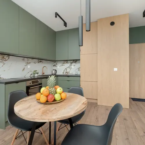 Płyta indukcyjna, lodówka z zamrażarką, piekarnik, czajnik elektryczny, zmywarka, komplet naczyń, przybory kuchenne, stół z krzesłami