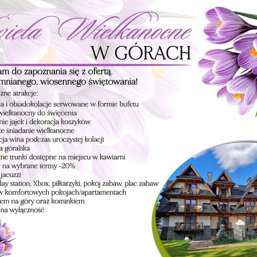 Willa Grand Karpatia Ski&Wellness to nowo otwarty obiekt położony u stóp Tatra w malowniczej miejscowości Murzasichle, łączący w sobie nowoczesny styl oraz klasykę drewna. Obiekt oferuje doskonałe miejsce na spędzenie wolnego czasu z rodziną, przyjaciółmi czy współpracownikami łącząc nowoczesne rozwiązania w zakresie wyposażenia, z klasycznym pięknem naturalnego drewna i kamienia, które występują zarówno w wyposażeniu pokoi jak i fasadzie zewnętrznej willi. Swoim gościom obiekt oferuje pokoje o podwyższonym standardzie z balkonami i przepięknym widokiem na Tatry oraz niezapomnianą atmosferę do wypoczynku, a także własną restauracje. W zależności od preferencji gości oferujemy pokoje rodzinne typu studio, z aneksem kuchennym, antresolą, pokoje dwuosobowe dla par oraz apartamenty z kominkiem i jacuzzi. Oprócz pokoi willa posiada również kilka pomieszczeń wielofunkcyjnych z bawialnią na dzieci, zapleczem rekreacyjnym, biznesowym oraz ogród rekreacyjny z basenem (otwarty do 18.09) i siłownią plenerową, Jacuzzi i licznymi atrakcjami dla dzieci.