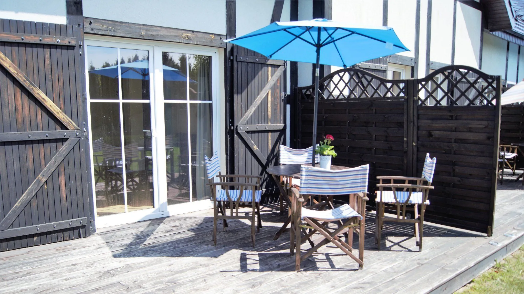 Każdy z apartamentów posiada osobne wejście, taras z meblami ogrodowymi.