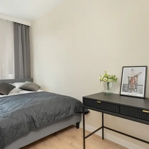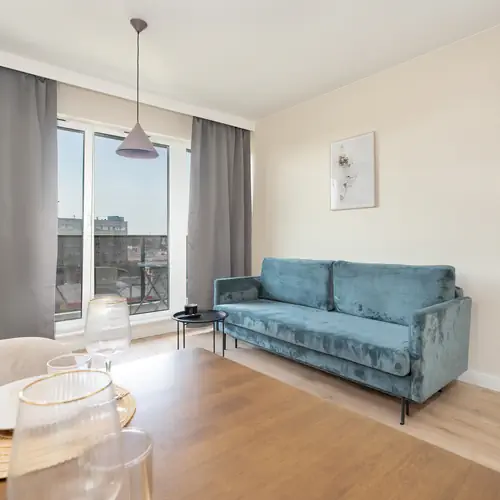 Apartament wykończony w eleganckim stylu może pomieścić 4 osób na powierzchni 39 m2. Wnętrze składa się z salonu, w którym znajduje się podwójna rozkładana sofa, aneksu kuchennego, oddzielnej sypialni z podwójnym łóżkiem oraz łazienki. Z salonu jest wyjście na balkon, gdzie można usiąść na wygodnych fotelach i pozwolić sobie na chwilę wytchnienia rozkoszując się filiżanką kawy. W części kuchennej znajdują się wszystkie niezbędne sprzęty kuchenne, dzięki którym goście mają możliwość przygotowania smacznych, domowych posiłków. Zarówno część kuchenna, jak i salon wyposażone są w białe meble, które w połączeniu ze złotymi elementami tworzą spójną kompozycję, nadając wnętrzu klasycznego i nowoczesnego wyglądu. Przestrzeń obiektu jest funkcjonalnie zaprojektowana, wychodząc naprzeciw wszelkim potrzebom gości. Udogodnienia obejmują wyposażenie multimedialne (telewizor z płaskim ekranem oraz bezpłatne łącze internetowe Wi-Fi). Ponadto w apartamencie dostępne jest żelazko, deska do prasowania, odkurzacz i pralka. W łazience znajduje się bezpłatny zestaw kosmetyków, ręcznik i suszarka do włosów. Do mieszkania przynależy prywatne miejsce parkingowe na platformie w garażu podziemnym. Zwierzęta są dopuszczalne w apartamencie za opłatą 100 PLN za pobyt.