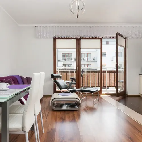 Rozkładana sofa dwuosobowa, pościel, stolik do kawy, fotel z podnóżkiem, szafa, komoda sprzęt RTV i AGD, centralne ogrzewanie, wyjście na balkon