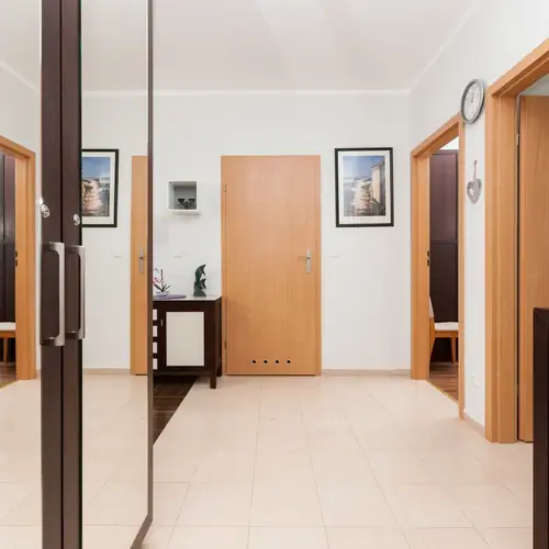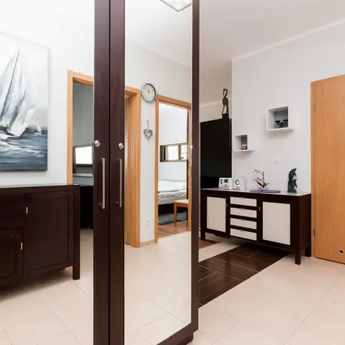 Komfortowo urządzony apartament z dwiema sypialniami o powierzchni 56 metrów położony na pierwszym piętrze ma możliwość zakwaterowania 6 osób. Gustownie zaprojekowana przestrzeń apartamentu oferuje przestronny salon z aneksem kuchennym, dwie sypialnie oraz łazienkę z prysznicem. Część dzienna wyposażona w wygodną sofę, fotel i TV stanowi doskonałe miejsce odpoczynku i relaksu, dodatkowo w pełni wyposażony aneks kuchenny umożliwia przyrządzenie posiłków. Przestrzeń sypialni wypełniają wygodne, podwójne łóżka i przestronna szafa. Przyjemna kolorystyka wnętrza, a także funkcjonalna przestrzeń zapewniają mieszkaniu domowy i przytulny klimat. Apartament posiada słoneczny balkon wyposażony w meble ogrodowe (trzy fotele tarasowe oraz stolik). Podróżujący z dziećmi rodzice mają możliwość rezerwacji łóżeczka oraz krzesełka dla swojej pociechy.