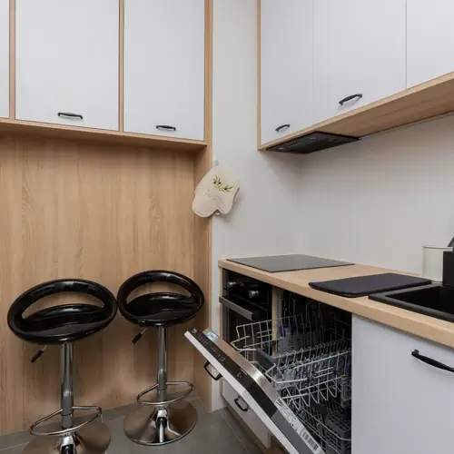 W pełni wyposażony apartament z 2 sypialniami może ugościć do 6 osób - to idealny wybór na wakacje z przyjaciółmi lub rodziną. Powierzchnia apartamentu podzielona na pokój dzienny, niezależną kuchnię, dwie sypialnie i łazienkę z prysznicem. Przytulną i domową aurę mieszkania potęguje szeroki wachlarz udogodnień, takich jak pełne wyposażenie kuchni (zmywarka, piekarnik), pralka czy suszarka do włosów. Wśród udogodnień multimedialnych znajduje się telewizor z płaskim ekranem oraz bezpłatne połączenie z siecią Wi-Fi. Goście mają do dyspozycji balkon wyposażony w meble ogrodowe z widokiem na okolicę.