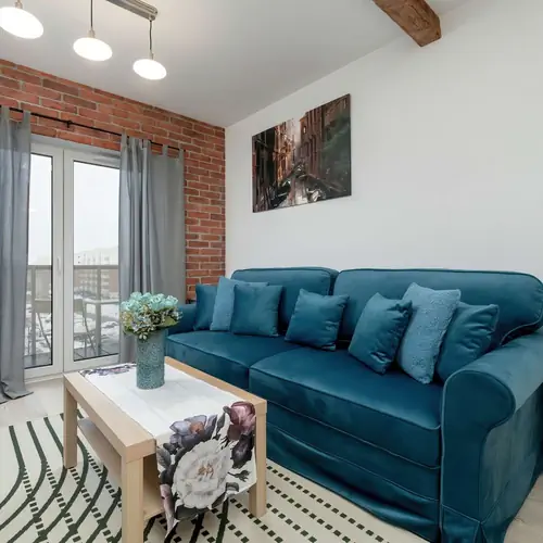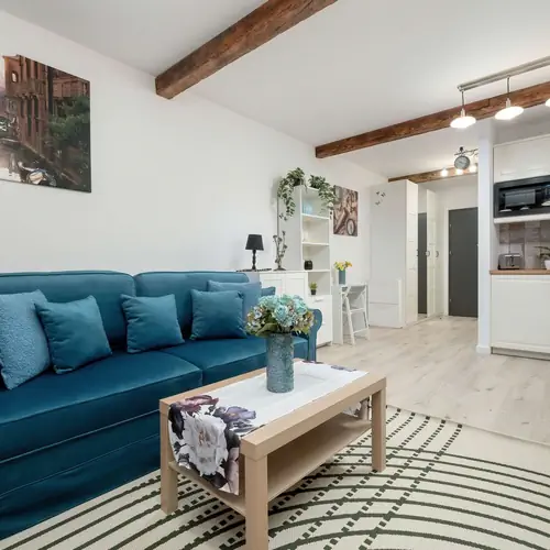 To komfortowe i stylowe studio jest przeznaczone dla dwóch osób i dysponuje umeblowanym balkonem, na którym można odpocząć, pijąc poranną kawę na powietrzu. Lokal jest doskonałym wyborem dla rodziców podróżujących z dzieckiem, osób pracujących zdalnie, a także par szukających kameralnej atmosfery. W części mieszkalnej znajduje się rozkładana sofa dwuosobowa, stolik, biurko z krzesłem, pojemna szafa, jadalniany stół z krzesłami i szafka idealna do przechowywania podręcznych drobiazgów. Wieczorami można się tutaj relaksować, oglądając ulubione programy telewizyjne. Funkcjonalnie wyposażony aneks kuchenny umożliwia proste i szybkie przygotowywanie posiłków oraz przekąsek. Dostępne są tutaj takie sprzęty jak toster, blender, kuchenka mikrofalowa, piekarnik czy też czajnik elektryczny. Łazienka została wyposażona w pralkę, prysznic, suszarkę do włosów i powitalny zestaw kosmetyków z ręcznikami. W wystroju wnętrza dominują eleganckie odcienie bieli i beżu, a o urozmaicenie kompozycji wizualnej dbają wyraziste akcenty w kolorach głębokiej czerni oraz niebieskiego. Sprawia to, że przestrzeń wygląda efektownie i nowocześnie.