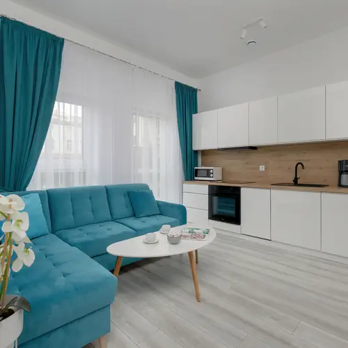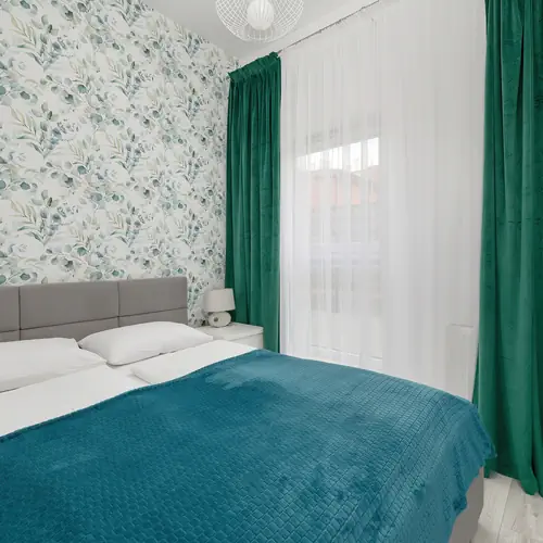 Ten stylowy i nowoczesny apartament ma do zaoferowania gościom dwie sypialnie. Jest on przeznaczony dla sześciu osób, co sprawia, że jest to świetne miejsce do wypoczynku dla podróżujących wspólnie znajomych czy też rodziców organizujących wyjazd ze swoimi pociechami. W aranżacji dominuje biel, dzięki czemu wnętrze jest stonowane i jasne. O urozmaicenie wystroju dbają odcienie szarości, czerwieni i koloru niebieskiego. W salonie znajduje się rozkładany narożnik, stolik, telewizor z dostępem do kanałów kablowych oraz wyjście na umeblowany balkon. Goście mogą więc jeść przekąski, pić poranną kawę i spożywać posiłki na powietrzu. W apartamencie dostępne są dwie sypialnie – w każdej z nich umieszczono szafkę, telewizor i dwuosobowe łóżko. O możliwość komfortowego przygotowywania posiłków dba funkcjonalnie wyposażony aneks kuchenny. Do dyspozycji są w nim takie sprzęty jak przelewowy ekspres do kawy, kuchenka mikrofalowa, płyta indukcyjna czy piekarnik. W lokalu znajduje się również łóżeczko i krzesełko dziecięce, a także pojemna szafa, w której mieści się deska do prasowania, żelazko, stojąca suszarka do ubrań i odkurzacz. Łazienka została wyposażona w prysznic, pralkę, powitalny zestaw kosmetyków i suszarkę do włosów.