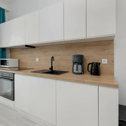 Kuchenka mikrofalowa, płyta indukcyjna, piekarnik, toster, zmywarka, zestaw sztućców i naczyń, kubki, szklanki, kieliszki do wina, garnki, patelnia, przelewowy ekspres do kawy, pochłaniacz pary, czajnik, lodówka z zamrażarką