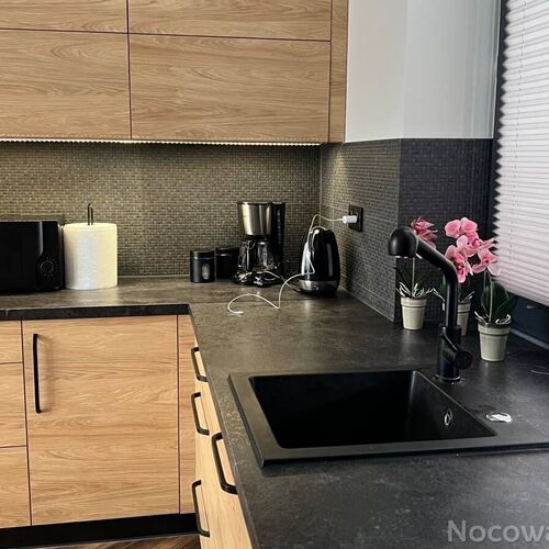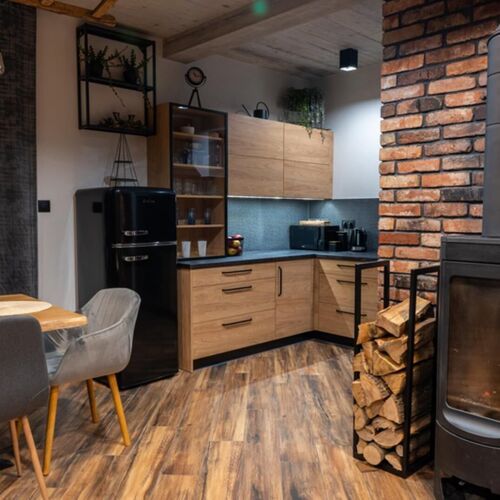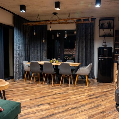 Jeśli potrzebujecie jeszcze więcej przestrzeni, dla dużej grupy, możecie powiększyć dom o apartament. Żeby się do niego dostać trzeba wyjść z domu i zejść schodami na dół. Tutaj przez duże drzwi balkonowe wejdziecie do saloniku z telewizorem. Jest tam rozkładana dwuosobowa sofa, stół jadalniany z czterema krzesłami oraz kominek. Z salonu jest wejście do kuchni, łazienki z prysznicem oraz sypialni z dwuosobowym łóżkiem (140x200), komodą na ubrania i lustrem.