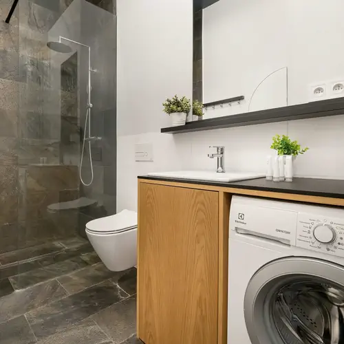 Prysznic, umywalka, szafka, lustro, wc, suszarka do włosów, pralka.