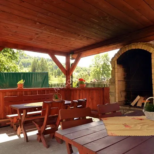 Na zewnątrz: Altanka z piecem wielofunkcyjnym (oświetlona, małe ognisko, grill, pieczenie) plac zabaw dla dzieci: piaskownica, huśtawki, boisko do mini piłki nożnej.
