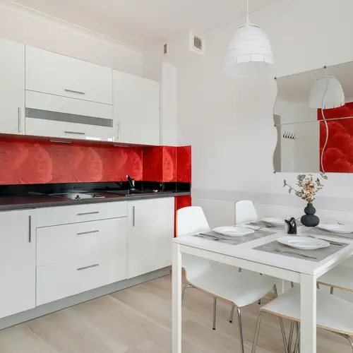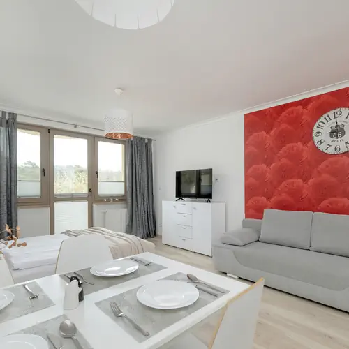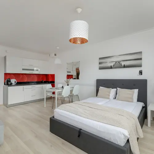 Stylowo urządzone, dobrze zagospodarowane studio o powierzchni 29 m² wygodnie ugości 4 osoby. Rozkład pomieszczeń obejmuje salon z aneksem kuchennym oraz z wyjściem na balkon, a także łazienkę z prysznicem. Przytulne wnętrze zapewnia odprężającą atmosferę dzięki modnemu, jasnemu wystrojowi z gustownie dobranymi dodatkami. W pełni wyposażony w wysokiej jakości sprzęty aneks kuchenny pozwala na przygotowanie domowych posiłków. Balkon z meblami ogrodowymi będzie idealnym miejscem do rozkoszowania się poranną kawą przygotowaną w dostępnym ekspresie. Przestronna, wypełniona światłem słonecznym przestrzeń salonu z zagospodarowaną strefą z rozkładaną sofą oraz wygodnym, podwójnym łóżkiem, to doskonałe miejsce relaksu i odpoczynku. Wieczorną rozrywkę zapewniają multimedia, takie jak telewizor Smart TV z płaskim ekranem, a także bezpłatny dostęp do sieci Wi-Fi. Na dobry początek pobytu zapewniamy gościom bezpłatny zestaw kosmetyków, ręczniki oraz pościel. Ponadto zwierzęta domowe są akceptowane za dodatkową opłatą.