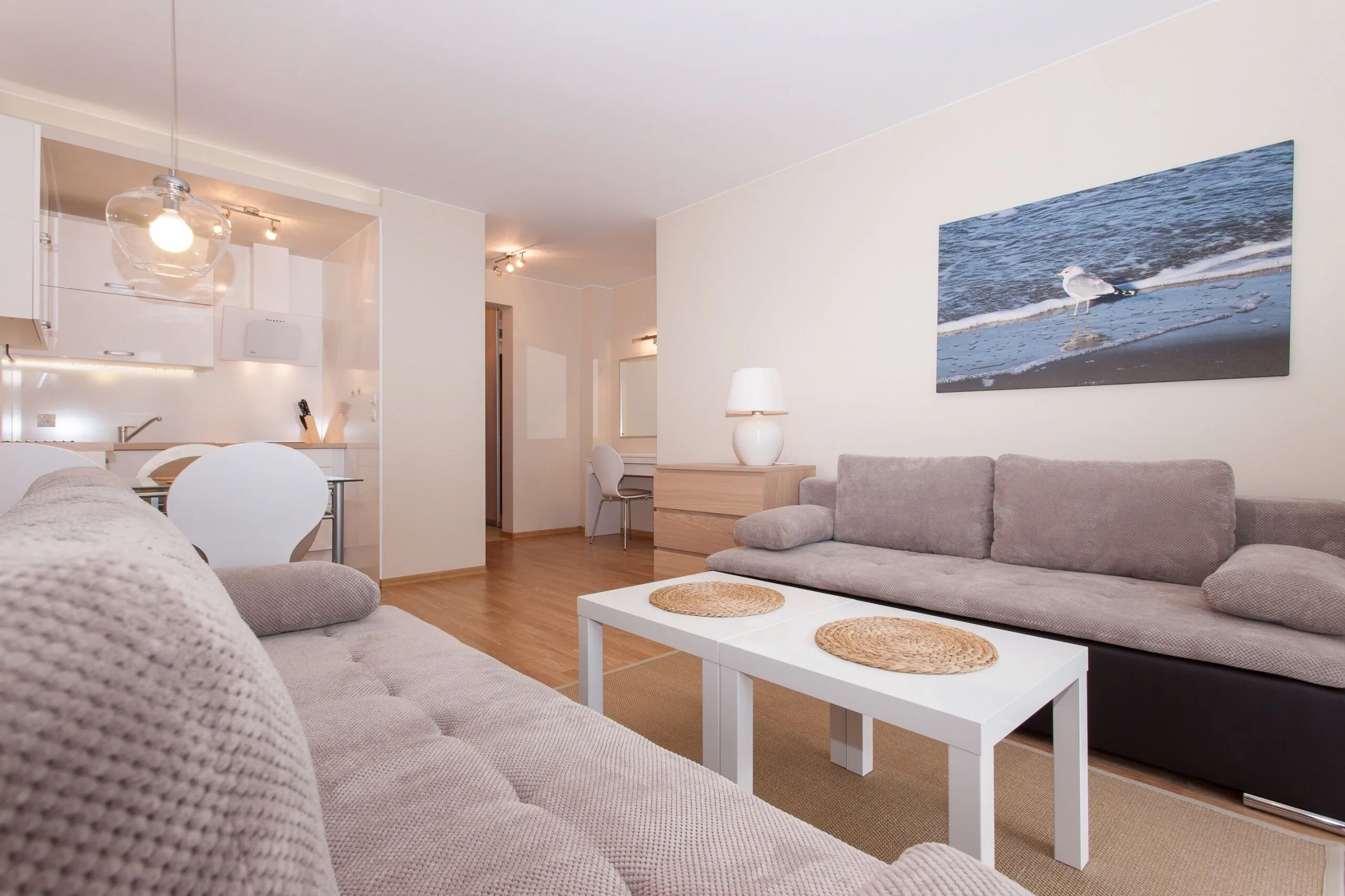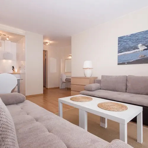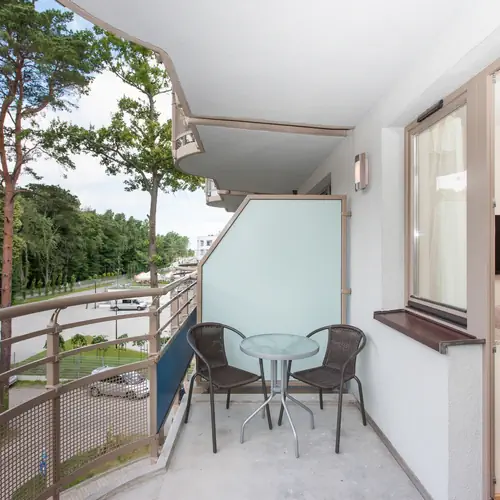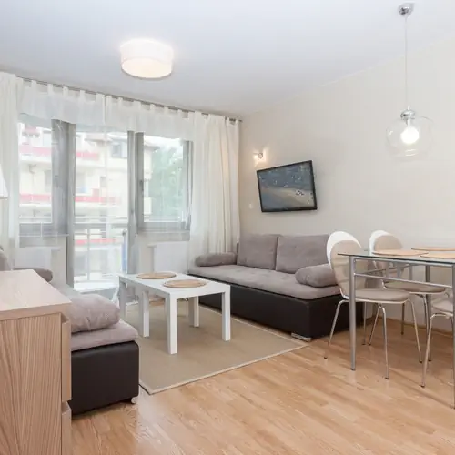 Przytulny i przestronny apartament usytuowany na trzecim piętrze ma możliwość zakwaterowania 6 osób. Starannie zaprojekowana przestrzeń apartamentu oferuje przestronny salon z aneksem kuchennym, sypialnię oraz łazienkę z prysznicem. Apartament wyróżnia się nowoczesnym i estetycznym wystrojem oraz funkcjonalnością. Część dzienna wyposażona w dwie wygodne rozkładane sofy i TV stanowi doskonałe miejsce odpoczynku i relaksu, dodatkowo w pełni wyposażony aneks kuchenny umożliwia przyrządzenie posiłków. Przestrzeń sypialni wypełnia wygodne łóżko, szafai szafki nocne. Przyjemny design oraz kompleksowe wyposażenie w niezbędne akcesoria kuchenne oraz łazienkowe gwarantują komfort pobytu. Apartament posiada słoneczny balkon, idealne miejsce na poranną kawę lub relaks po całym dniu zwiedzania Świnoujścia. Podróżujący z dziećmi rodzice znajdą w wyposażeniu apartamentu również łóżeczko oraz krzesełko dla swojej pociechy.