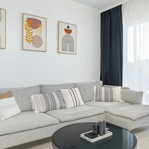 Ten przestronny apartament jest przeznaczony dla sześciu osób i ma trzy sypialnie, dzięki czemu jest to doskonałe miejsce dla rodziców z dziećmi oraz podróżujących wspólnie przyjaciół. Przestrzeń jest przyjazna również dla uczestników wyjazdów biznesowych. W salonie stoi narożnik i stolik, przy którym można wypić poranną kawę, a także jadalniany stół z krzesłami idealny do serwowania i spożywania posiłków. Znajduje się tutaj również telewizor z dostępem do kanałów naziemnych. Z pomieszczenia goście mogą wyjść na umeblowany balkon – na powietrzu umieszczono stolik i dwa krzesła, co umożliwia relaks w przerwie od zaplanowanych aktywności. W pierwszej sypialni znajduje się duże dwuosobowe łóżko, a także pojemna szafa do przechowywania przywiezionych rzeczy. Druga sypialnia została natomiast wyposażona w wygodne, podwójne łóżko oraz biurko do komfortowej pracy zdalnej. W trzeciej sypialni stoi rozkładana sofa dwuosobowa, szafa i stolik z tapicerowanym krzesłem. Rodzice podróżujący ze swoimi pociechami mogą znaleźć w apartamencie łóżeczko oraz krzesełko dziecięce. Posiłki można wygodnie przygotowywać w aneksie kuchennym, w którym dostępne są sprzęty takie jak kuchenka mikrofalowa, piekarnik czy też przelewowy ekspres do kawy. W łazience na odwiedzających czeka powitalny zestaw kosmetyków, ręczniki, suszarka do włosów, pralka i prysznic. W wystroju dominują subtelne i eleganckie odcienie, a aranżacja prezentuje się gustownie oraz nowocześnie. W salonie wykorzystano barwę szarą, podczas gdy w sypialniach z łóżkami zastosowano kompozycję bieli i jasnego różu. Goście mogą przyjeżdżać tutaj ze swoimi zwierzętami.