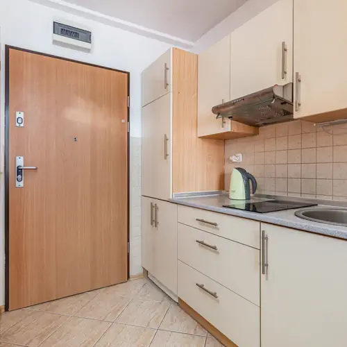 Apartament usytuowany na 2. piętrze ma możliwość zakwaterowania 4 osób. Przestrzeń apartamentu oferuje przestronny salon z aneksem kuchennym, sypialnie oraz łazienkę z prysznicem. Część dzienna wyposażona w kanapę oraz telewizor stanowi doskonałe miejsce odpoczynku i relaksu, dodatkowo w pełni wyposażony aneks kuchenny umożliwia przyrządzenie posiłków. W sypialni znajduje się wygodne łóżko małżeńskie oraz szafa. Kameralna aranżacja mieszkania oraz kompleksowe wyposażenie w niezbędne akcesoria kuchenne oraz łazienkowe gwarantują komfort pobytu. Podróżujący z dziećmi rodzice znajdą na wyposażeniu apartamentu również łóżeczko oraz krzesełko dla swojej pociechy.