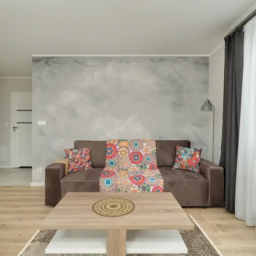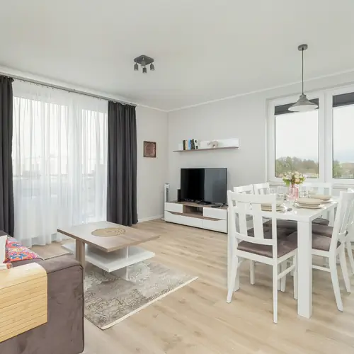 Ten gustownie urządzony apartament jest przeznaczony dla sześciu osób, dzięki czemu może się on świetnie sprawdzić w przypadku rodziców podróżujących z dziećmi, a także osób planujących wycieczkę z przyjaciółmi. Obecność miejsca do pracy zdalnej sprawia, że również uczestnicy wyjazdów biznesowych mogą korzystać z funkcjonalnego wnętrza. W apartamencie dostępne są dwie stylowo zaaranżowane sypialnie, a w salonie znajduje się rozkładana kanapa dwuosobowa, na której można usiąść i oglądać telewizję lub pić kawę przy stoliku. Z salonu można wygodnie dostać się na balkon, z którego widać zarówno drzewa, jak i miejską architekturę. Na balkonie ustawiony został stolik i dwa krzesła, co pozwala na spożywanie posiłków lub picie napojów na powietrzu. Intrygujące i nowoczesne ozdoby sprawiają, że wystrój wnętrza jest bardzo interesujący i urozmaicony. W salonie znajduje się klimatyzator słupkowy, którym steruje się przy pomocy pilota. Goście mają tutaj do dyspozycji różnej wielkości szafki i szafy, a zatem przechowywanie ubrań, drobiazgów, czy też posiadanych sprzętów i akcesoriów jest bardzo wygodne i proste. Jedna z sypialni jest utrzymana w delikatnej, zielonej kolorystyce, podczas gdy ściany drugiej mają jasnofioletowy odcień. W apartamencie dominuje biel, choć pojawiają się również wyraziste, ciemne akcenty.