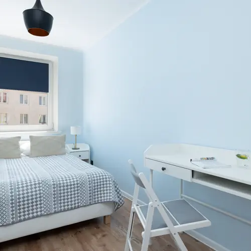Łóżko małżeńskie, pościel, szafki i lampki nocne, szafa, biurko z krzesłem