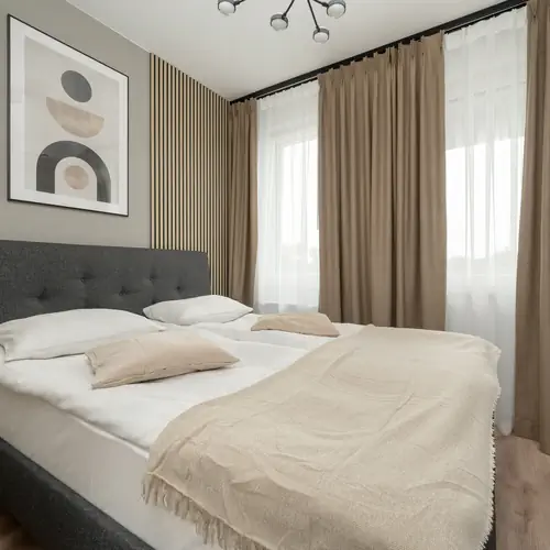 Ten elegancki i nowoczesny apartament jest przeznaczony dla czterech osób. Znajduje się on na trzecim piętrze budynku, dzięki czemu z umeblowanego balkonu, na którym stoi stolik z dwoma krzesłami, goście mogą podziwiać ładny widok na okoliczną zieleń. Meble ogrodowe sprawiają, że odwiedzający mogą zjeść przekąskę lub wypić poranną kawę na powietrzu w przyjemnej atmosferze. Lokal dysponuje również klimatyzacją, co zapewnia gościom komfort zarówno krótkiego, jak i długoterminowego pobytu. W aranżacji wnętrza dominują stonowane kolory takie jak beż, czy też barwa jasnoszara. Nie brakuje tu również wyrazistych czarnych oraz drewnianych akcentów dbających o urozmaicenie kompozycji. W salonie stoi rozkładana sofa dwuosobowa, na której można spać lub usiąść wieczorem, aby zrelaksować się, oglądając telewizję kablową. W pomieszczeniu umieszczono również stolik i jadalniany stół z krzesłami. Sypialnia ma do zaoferowania gościom duże i wygodne łóżko dla dwóch osób, a także pojemną szafę. Funkcjonalnie wyposażony w sprzęty takie jak kapsułkowy ekspres do kawy, kuchenka mikrofalowa czy też czajnik aneks kuchenny umożliwia proste przygotowywanie posiłków. Dostępna jest w nim też pralka. W łazience odwiedzający mogą korzystać z prysznica, powitalnego zestawu kosmetyków, ręczników i suszarki do włosów.