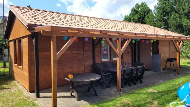 Przy domku jest sauna, duży zadaszony taras. Zabawki dla dzieci, piaskownica, hamak, huśtawka, piłki, kosz do koszykówki, meble ogrodowe, leżaki, miejsce na ognisko, grill.