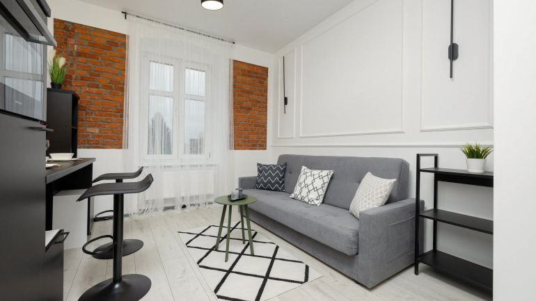 Stylowy apartament typu studio mieści się na drugim piętrze budynku bez dostępu do windy. Pomieścić może dwie osoby, jest to więc idealna opcja dla pary lub osoby podróżującej w pojedynkę. Dwa miejsca noclegowe znaleźć można na podwójnej rozkładanej sofie znajdującej się w części mieszkalnej. Mieszczący się tuż obok aneks kuchenny posiada w swoim wyposażeniu m.in. płytę indukcyjną oraz piekarnik - za ich pomocą przygotować można pyszny posiłek. Apartament nie posiada pralki, natomiast na trzecim piętrze budynku mieści się pralnia na monety. Elegancka łazienka wyposażona jest w prysznic, umywalkę, ręczniki oraz zestaw bezpłatnych kosmetyków. Studio posiada dostęp do wszelkich udogodnień multimedialnych, takich jak telewizor z płaskim ekranem (SmartTV+) oraz szybkie połączenie WiFi. Do apartamentu nie przynależy żadne miejsce parkingowe. Pobyty ze zwierzętami są mile widziane – obowiązuje dodatkowa opłata.