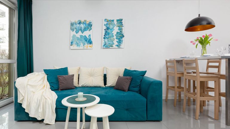 Podwójna rozkładana sofa, TV, stolik kawowy, wyjście na taras