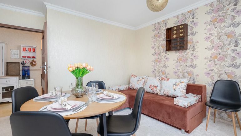 Rozkładana sofa, TV, stół z 4 krzesłami, wyjście na balkon