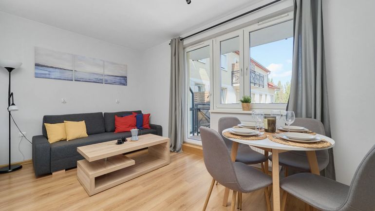 Ten wrocławski apartament o powierzchni 37 m² jest odpowiedni dla 4 gości. To świetne miejsce noclegowe dla rodzin preferujących spokój i wytchnienie od zgiełku miasta. Mieszkanie składa się dwóch pokoi - słonecznego salonu z aneksem kuchennym oraz wyjściem na balkon, sypialni z wygodnym łóżkiem małżeńskim oraz łazienki z prysznicem. Rozkładana sofa umieszczona w części dziennej zapewni udany relaks po długim dniu, jak i komfortowy sen. Na balkonie znajdują się meble ogrodowe, dzięki czemu Goście mogą rozkoszować się popołudniową filiżanką kawy na świeżym powietrzu. Nowoczesny wystrój wnętrza, z użyciem jasnej palety barw oraz przyjemnych dla oka dodatków, wprowadza miłą i domową atmosferę. Udogodnienia multimedialne w apartamencie obejmują nowoczesny telewizor oraz bezpłatne łącze wi-fi. W salonie znajdziemy również biurko umożliwiające Gościom komfortową pracę zdalną. Kompleksowe wyposażenie kuchenne gwarantuje pełną swobodę w przyrządzaniu smacznych, domowych posiłków, którymi można cieszyć się z rodziną przy jadalnianym stole znajdującym się w salonie. Podróżujący ze zwierzętami są mile widziani - miejsce to jest przyjazne pupilom. Ponadto, przed obiektem znajduje się ogólnodostępny, bezpłatny parking.